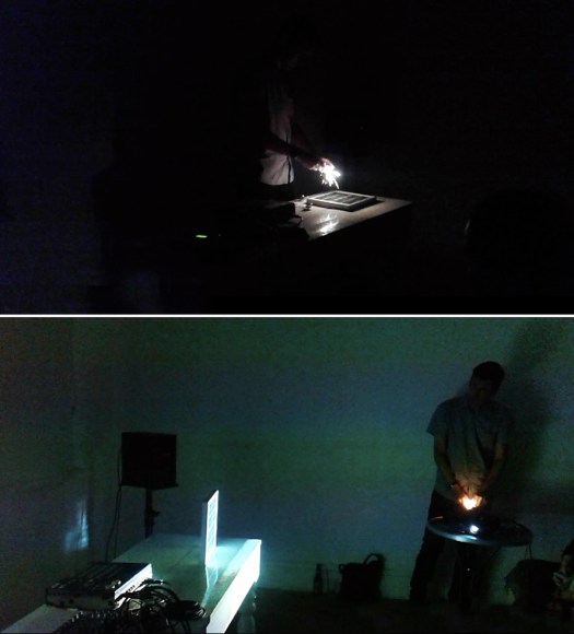 Geminids is a performance work with two parts, aimed at reimagining cosmic phenomena such as meteor showers as something that might be reproducible in miniature and indoors. Firstly, the energy from bursts of sparks produced by handheld gas lighters is realised as sound using a photovoltaic (or solar) panel (see top image). Then a tiny video camera is used to catch images of the bursts of sparks, which are then projected onto the solar panel, producing a very different account of the energies involved (bottom image).
