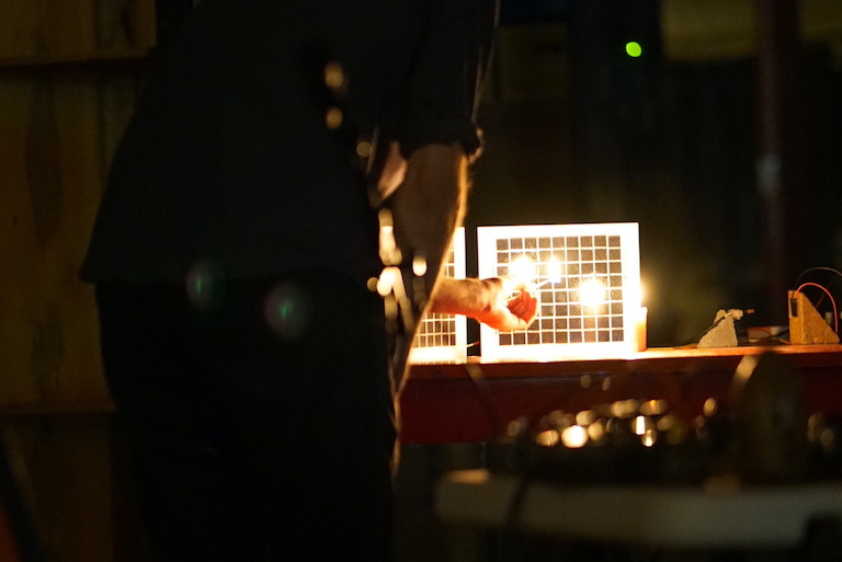 Glim is a low energy performance. It uses only the light from a candle and one match to power two piezoelectric buzzers attached to solar panels, producing its own sound in response to the available energy.