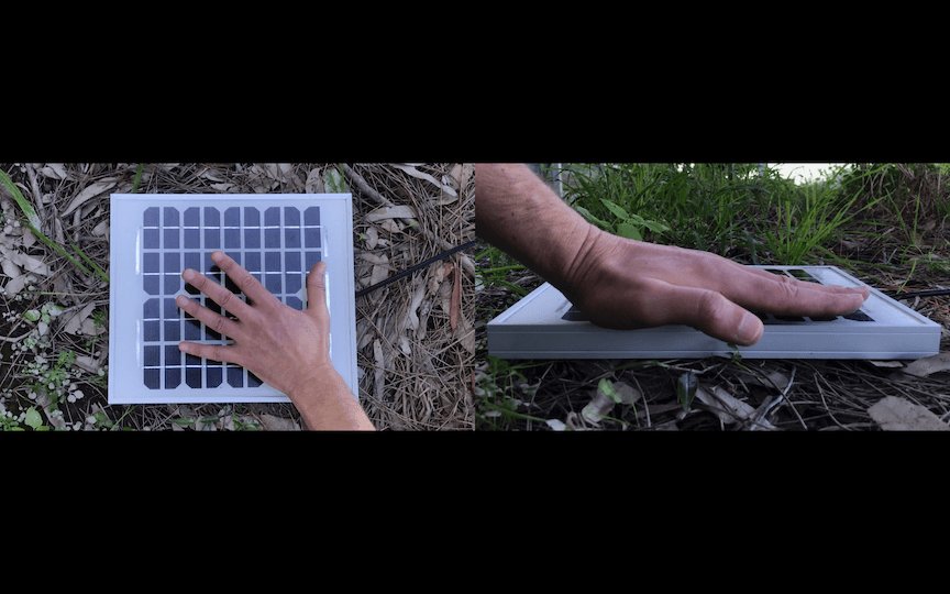 My hand also interrupts the steady flow of photons onto the panel, no doubt contributing its own changes in texture and reaction, which is further complicated by me moving my hand around in response to the sounds I’m hearing, searching out new interactions. Sunlight, hand, panel and shadow combine to produce swelling, energetic, oceanic noise, here doubled through the separate performances seen on the left and right of the screen.